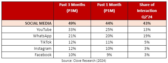According to data from Clove Research in 2024 (Q2) with 1,260 respondents, social media accounted for 43% of the total interaction share.